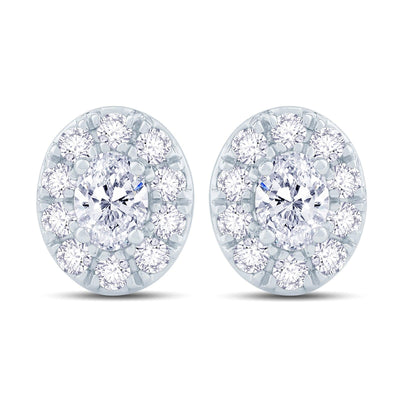 These stunning 18ct white gold stud earrings are set with sparkling oval shaped centre diamond surrounded by a halo of brilliant cut diamonds. Comes in the size of your choice.
