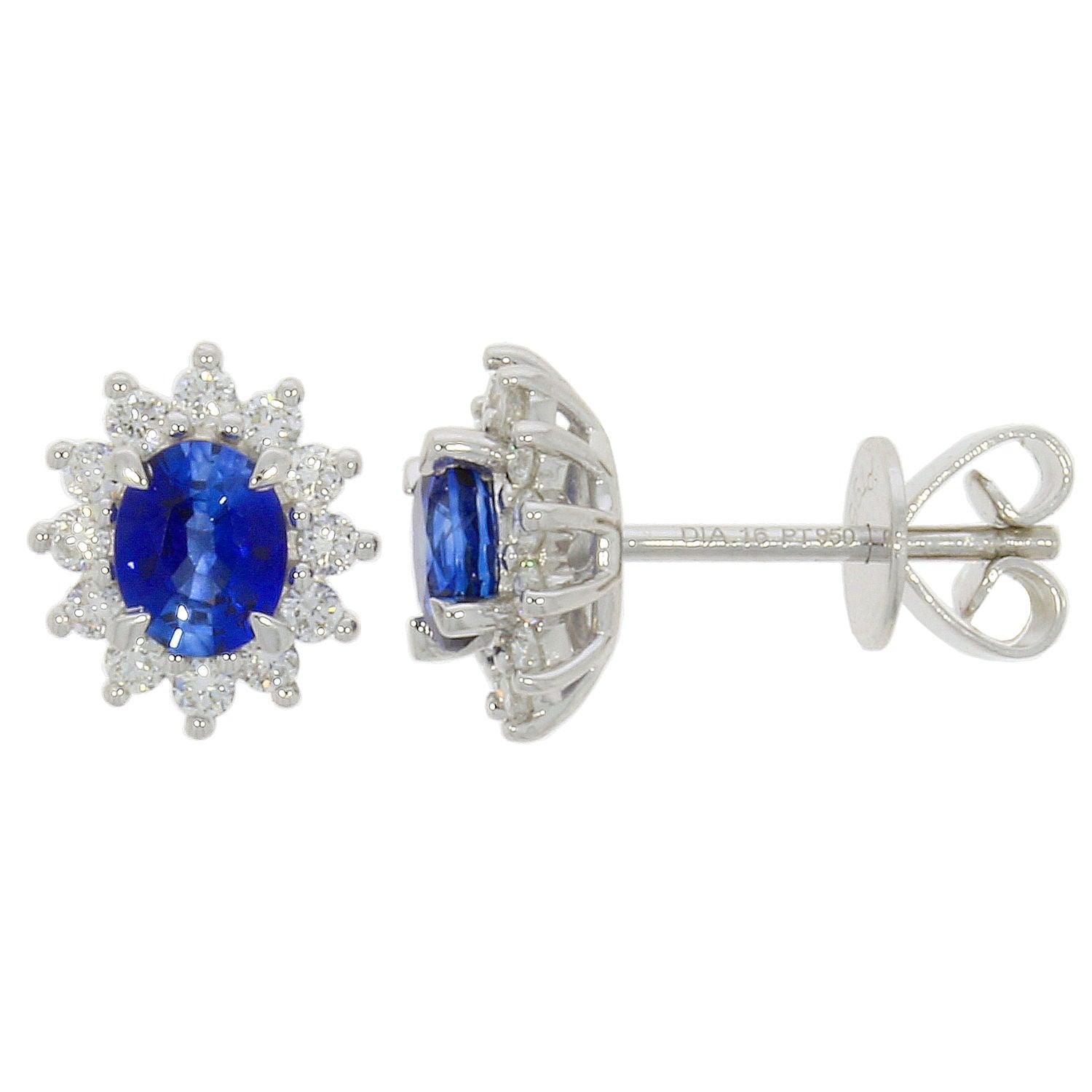 These stunning platinum earrings are claw set with stunning 0.96ct oval shaped sapphires surrounded by a brilliant cut diamond halo with a total carat weight of 0.33ct.