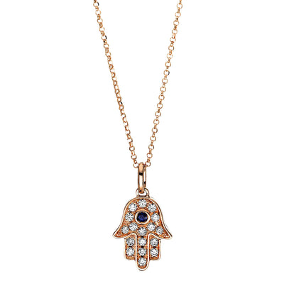 This stunning 18ct Rose Gold hand style pendant is set with a 0.03ct blue sapphire centre stone accompanied by 0.19ct brilliant cut diamonds. Comes with an 18" chain.