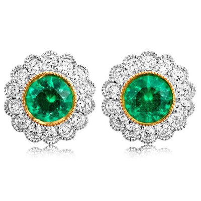 This beautiful 18ct white gold earrings are rim set with 0.58ct round emeralds with a brilliant cut halo set with a total carat weight of 0.39ct
