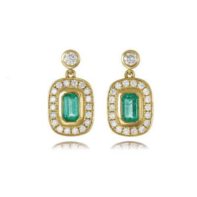 These beautiful 18ct yellow gold earrings are rim set with 0.56ct emeralds surrounded by a halo of brilliant cut diamonds with a total carat weight of 0.37ct